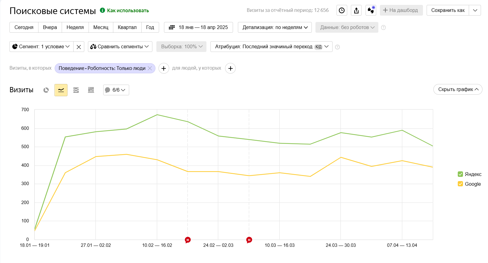 - Визиты из Яндекса выросли с ~80 до ~660 в неделю.